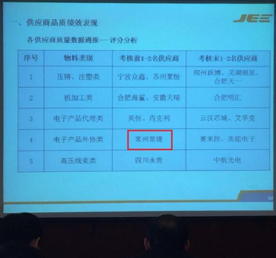 本次大會(huì)以“合作發(fā)展”為主題,聚焦“匠心精神”,會(huì)上深情回顧了“江淮巨一”2016年發(fā)展目標(biāo)及完成情況,以及對(duì)供應(yīng)商質(zhì)量管理工作的績(jī)效。同時(shí)結(jié)合當(dāng)前形勢(shì),提出了2017年的質(zhì)量提升計(jì)劃,并在2016年采購(gòu)基礎(chǔ)上,展示了2017年采購(gòu)工作計(jì)劃。在2016年供應(yīng)商品質(zhì)績(jī)效評(píng)價(jià)中,CJE在電子產(chǎn)品外協(xié)類中被評(píng)定為前1-2名的供應(yīng)商,這是JEE對(duì)CJE電容器品質(zhì)的肯定。